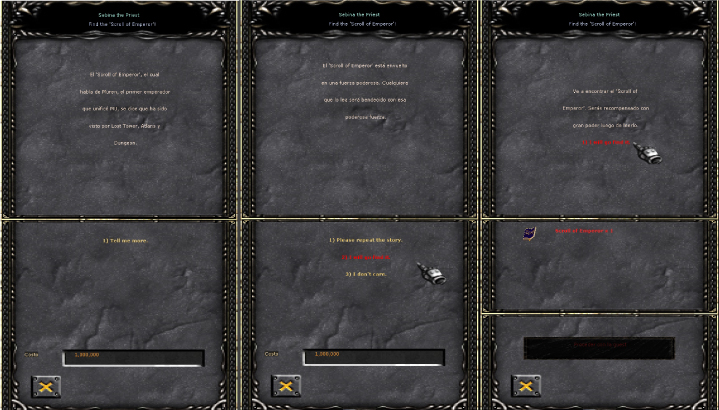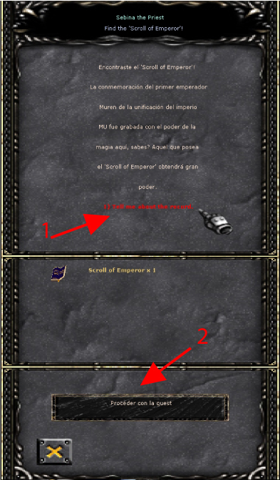 Emprenderemos la tenebrosa búsqueda del Scroll of Emperor, como la Priest Sevina nos indicó, en las oscuras tierras de Lost Tower, o en las profundidades de Atlans. Iremos eliminando monstruos que encontremos en estos mapas, y alguno de ellos dejará caer el tan ansiado libro. Esta misión pondrá a prueba nuestro temple, ya que puede durar minutos, horas, o incluso días! No debemos perder la calma...